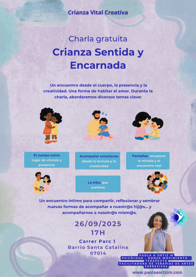 En este taller uniremos la psicoeducación con el enfoque expresivo- somático desde las terapias de artes expresivas para explorar qué hay detrás del uso (o abuso) de las pantallas, y cómo podemos crear alternativas que nutran la conexión en la crianza.